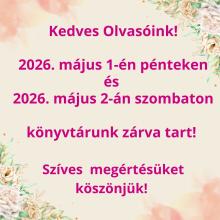 Könyvtárunk a húsvéti ünnepkörben Nagypénteken - 2026. április 3-án - és Nagyszombaton - 2026. április 4-én - zárva tart! A héten az utolsó kölcsönzési nap csütörtök. Nyitás: 2026. április 7-én kedden a felnőttrészlegen 10.00 órakor, a gyermekrészlegen 13.00 órakor. Kellemes húsvéti ünnepeket kívánunk!