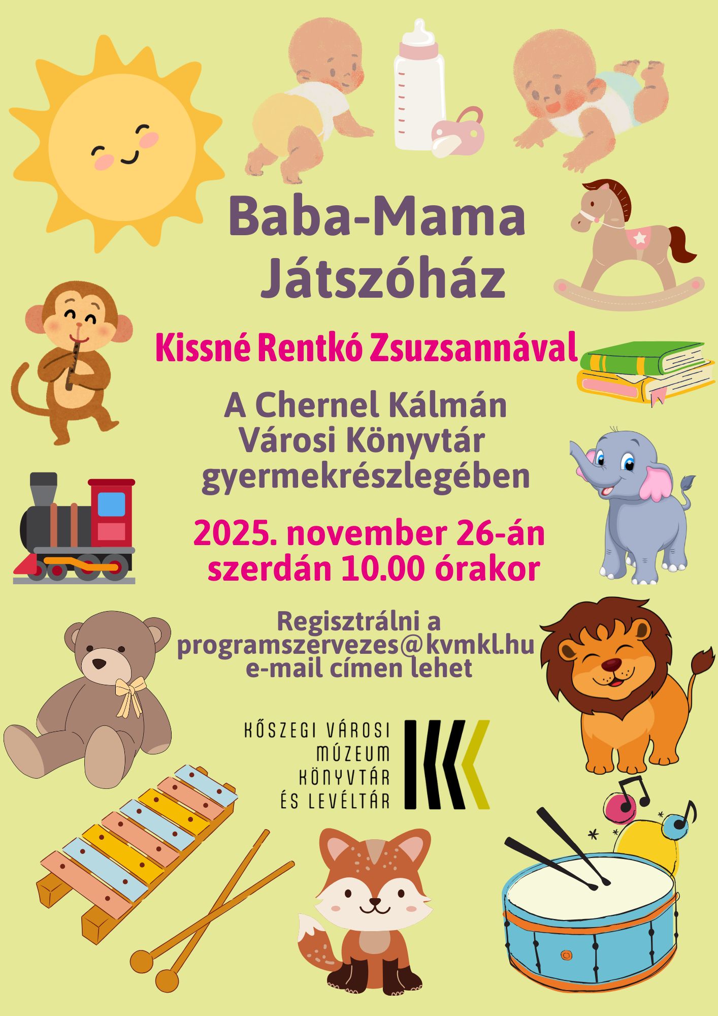 2025. november 26-án szerdán, 10.00 órától sok szeretettel várjuk a legkisebbeket második emeleti gyermekrészlegünkbe Kissné Rentkó Zsuzsanna BABA-MAMA foglalkozására! Regisztrálni a programszervezes@kvmkl.hu e-mail címen lehet.