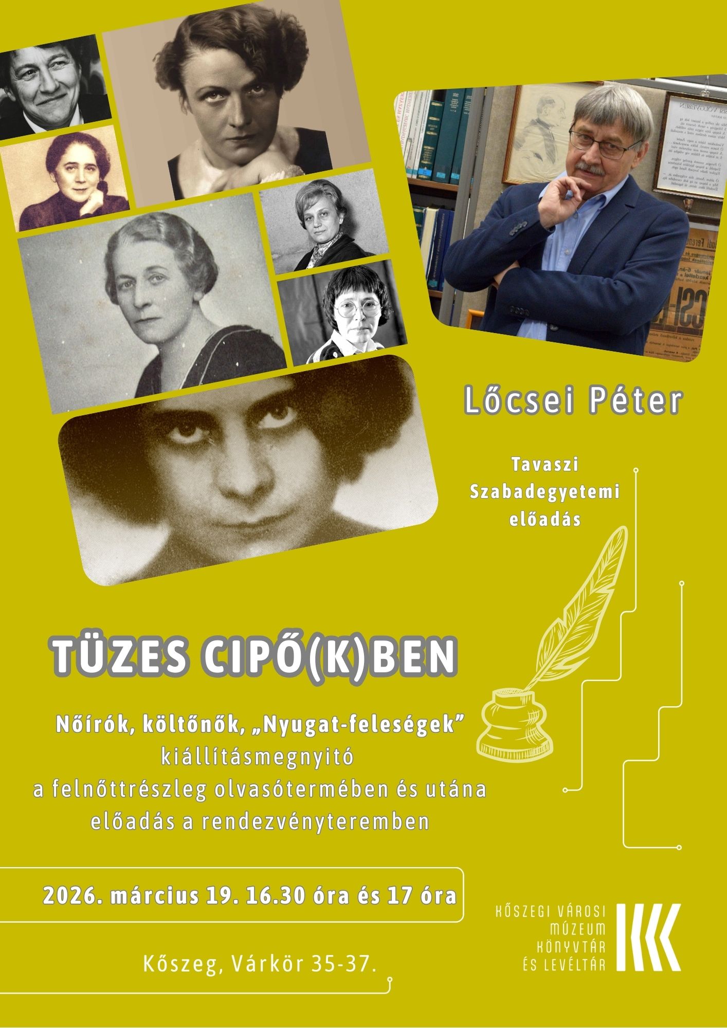 17.00 órától a második emeleti rendezvénytermünkben a Kőszegi Városi Múzeum, Könyvtár és Levéltár szervezésében a Tavaszi Szabadegyetemi Előadás-sorozat részeként Lőcsei Péter mesél a kiállításon szereplő hölgyek irodalmi munkásságáról. Arról, hogy milyen volt a női alkotók szerepe az irodalomban, melyről többféle vita folyt a hazai sajtóban. A XIX. század eleje óta számos – olykor rendkívül sarkos – vélemény fogalmazódott meg velük kapcsolatban. Szó esett személyiségükről, sikereikről, nehézségeikről, választott témáikról. Aki megpróbálkozik a határok tágításával, az értelmetlen korlátok ledöntésével, gyakran találkozik értetlenséggel, elutasítással. Azok a költőnők, írónők, akik utat törtek, méltó figyelmet igényeltek, rendre tüzes cipőkben érezhették magukat. Küzdelmük eredményei mellett fájdalmaikról, olykor megalázó helyzetükről is beszámoltak.